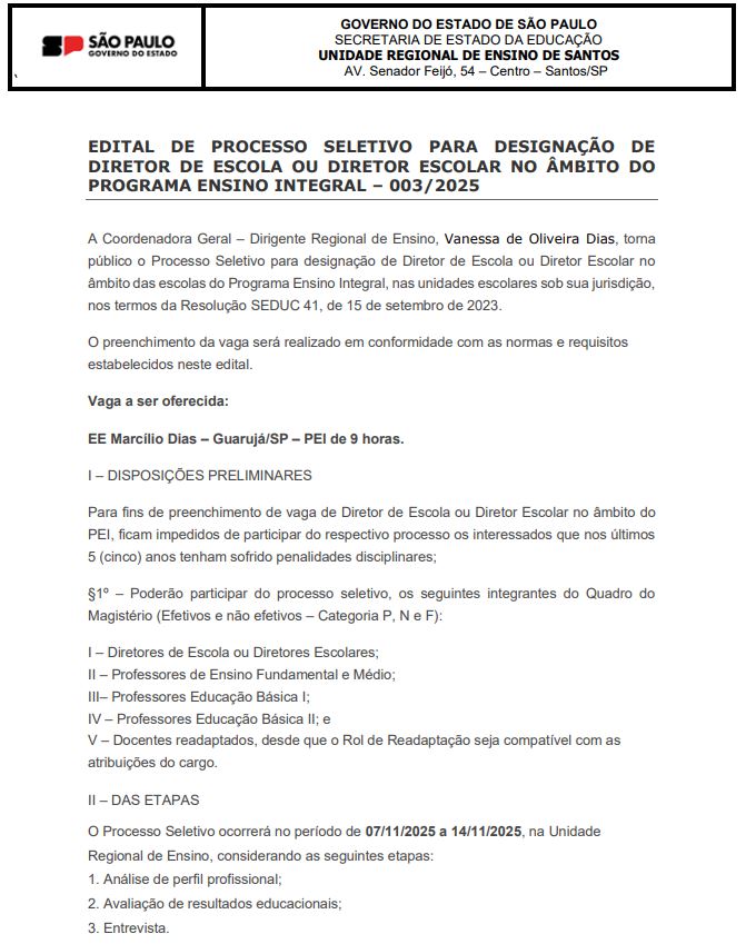 Edital Credenciamento Diretor PEI – EE Marcílo Dias 05-11-2517 de novembro de 2025 Enviar por e-mail Publicado em 05/11/2025 Clique aqui para ver o edital completo LEIA TAMBÉM Edital CGP – Prof. Aparecida Carlos Antônio Vidal Alinhamento das Equipes URESAN e URESV para a Atribuição Inicial 2026 Dia A da Alfabetização Edital Professor Especialista em Currículo – PEC
