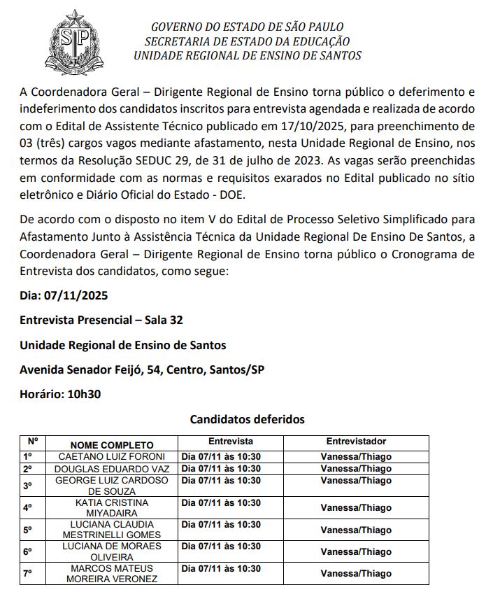 Edital Entrevista Assistente Técnico 05-11-2517 de novembro de 2025 Enviar por e-mail Publicado em 05/11/2025 Clique aqui para ver o edital completo LEIA TAMBÉM Edital CGP – Prof. Aparecida Carlos Antônio Vidal Alinhamento das Equipes URESAN e URESV para a Atribuição Inicial 2026 Dia A da Alfabetização Edital Professor Especialista em Currículo – PEC