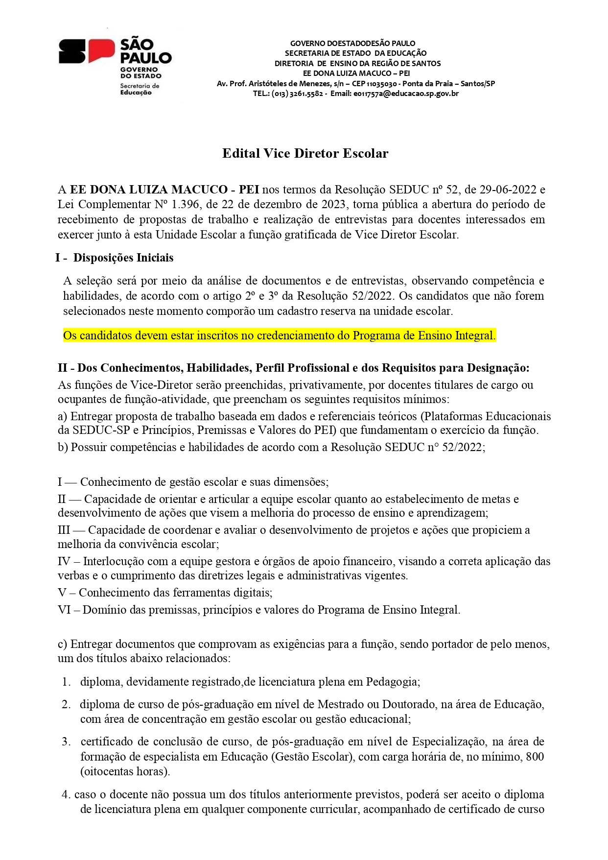 Edital Vice-Diretor – EE Dona Luiza Macuco