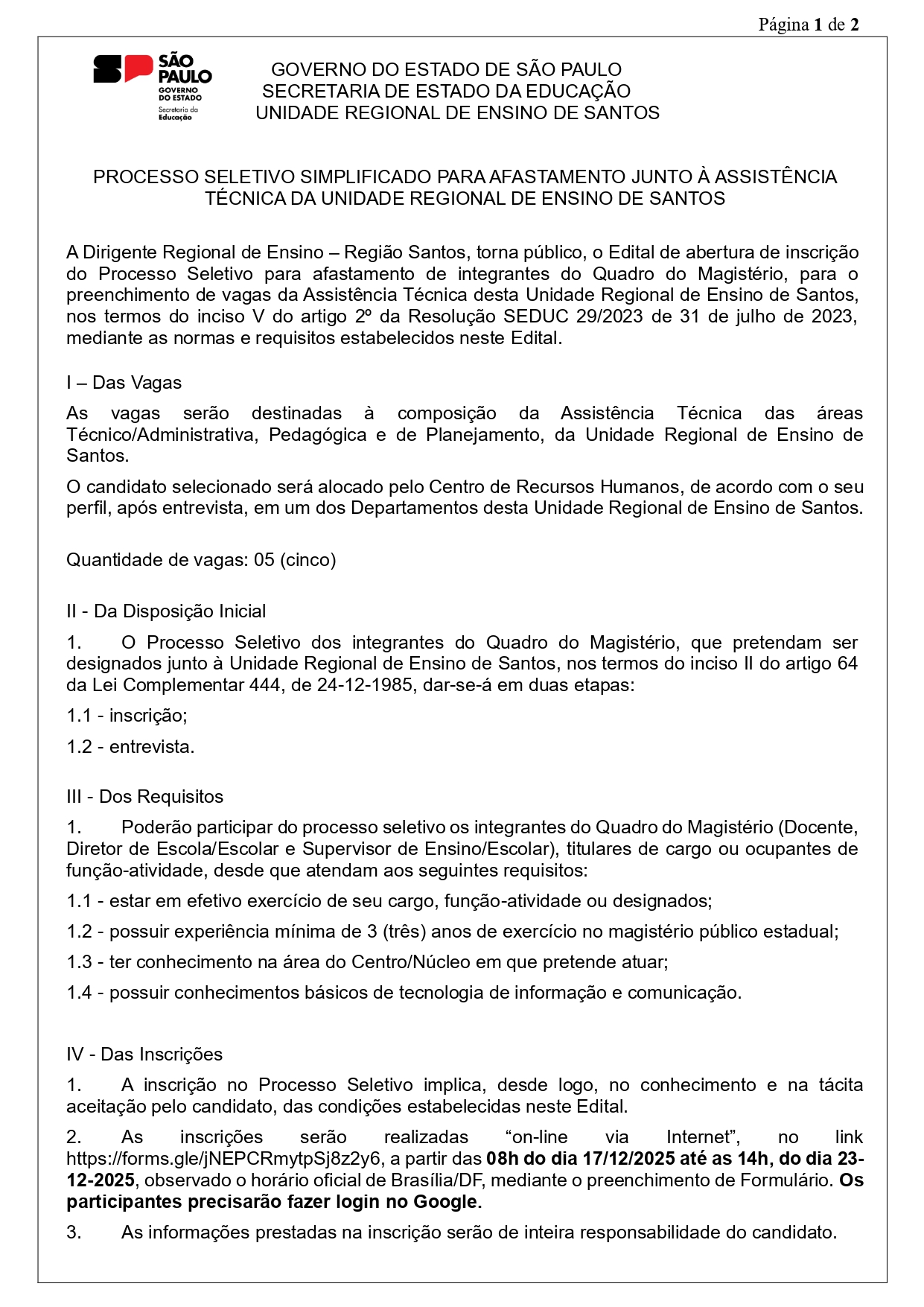 Processo Seletivo – Assistente Técnico Administrativo 17-12-25 Enviar por e-mail Publicado em 17/12/2025 ⇒ Clique aqui para ver o edital completo ⇐ ⇒ Clique aqui para ver o edital completo⇐ LEIA TAMBÉM Professor Tutor Portaria de Convocação dos Candidatos indicados a não permanência das Unidades Escolares PEI e Parciais Edital de Credenciamento Diretor PEI – EE Lucas Nogueira Garcez Edital Vice-Diretor EE Prof. Primo Ferreira