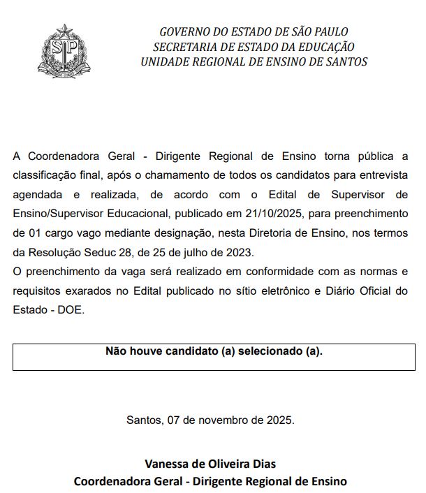 Processo Seletivo – Classificação Final Supervisor de Ensino 10-11-2517 de novembro de 2025 Enviar por e-mail Publicado em 10/11/2025 Clique aqui para ver o edital completo LEIA TAMBÉM Edital CGP – Prof. Aparecida Carlos Antônio Vidal Alinhamento das Equipes URESAN e URESV para a Atribuição Inicial 2026 Dia A da Alfabetização Edital Professor Especialista em Currículo – PEC