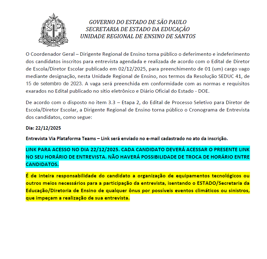 Processo Seletivo Diretor de Escola/Diretor Escolar – Deferidos Entrevista 19-12-2519 de dezembro de 2025 Enviar por e-mail Publicado em 19/12/2025 ⇒ Clique aqui para ver o edital completo ⇐ ⇒ Clique aqui para ver o edital completo⇐ LEIA TAMBÉM Edital Coordenador de Gestão Pedagógica (CGP) – EE Milton Borges Ypiranga Processo Seletivo Professor Tutor Anos Finais – Candidatos Indeferidos Processo Seletivo Professor Tutor Anos Finais – Candidatos Deferidos Processo Seletivo – Assistente Técnico Administrativo