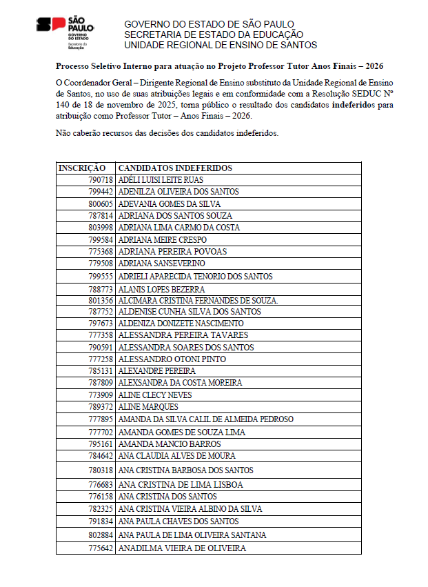 Processo Seletivo Professor Tutor Anos Finais – Candidatos Indeferidos 19-12-2519 de dezembro de 2025 Enviar por e-mail Publicado em 19/12/2025 ⇒ Clique aqui para ver o edital completo ⇐ ⇒ Clique aqui para ver o edital completo⇐ LEIA TAMBÉM Edital Coordenador de Gestão Pedagógica (CGP) – EE Milton Borges Ypiranga Processo Seletivo Diretor de Escola/Diretor Escolar – Deferidos Entrevista Processo Seletivo Professor Tutor Anos Finais – Candidatos Deferidos Processo Seletivo – Assistente Técnico Administrativo